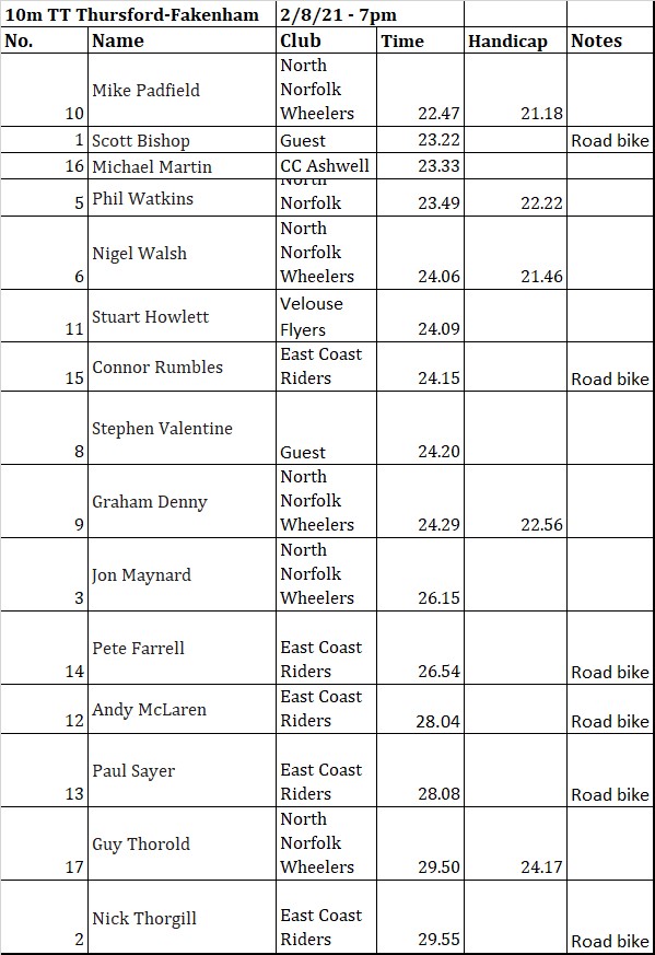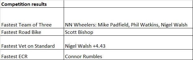 A hot, windy night was enjoyed by a good turnout of 15 riders from various clubs in Norfolk on the sporting Thursford to Fakenham Course. Winners in the fastest team of three, road bike, Vet on standard (over 40 based on age) and fastest East Coast Rider each received a North Norfolk Wheelers medal. Thanks to the timekeeper and marshals.