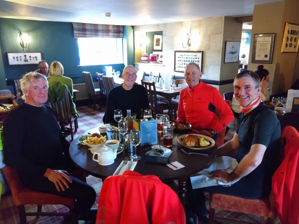 Onwards then through pretty Saxlingham and Field Dalling. On reaching Binham, we took the Stiffkey Road towards, well, Stiffkey, but turned right to hurtle through Cockthorpe, past Langham Dome, and then via Langham, Blakeney and Wiveton to reach the Three Swallows after 33 miles. We parked our bikes in the garden (nicely decked out but not really a day to be sat outside!) and entered the bar area. We spurned the open fire (far too cosy), and found a table near the bar. They do a ‘lunch spesh’ – a choice of food and a drink for £11. Ham, Egg & Chips and a pint of Landlord seemed a no brainer for two of us and was excellent. Chris opted for soup and a pot of tea. Hmm… Not sure what was the smallest, the soup bowl, the teacup or the teapot.