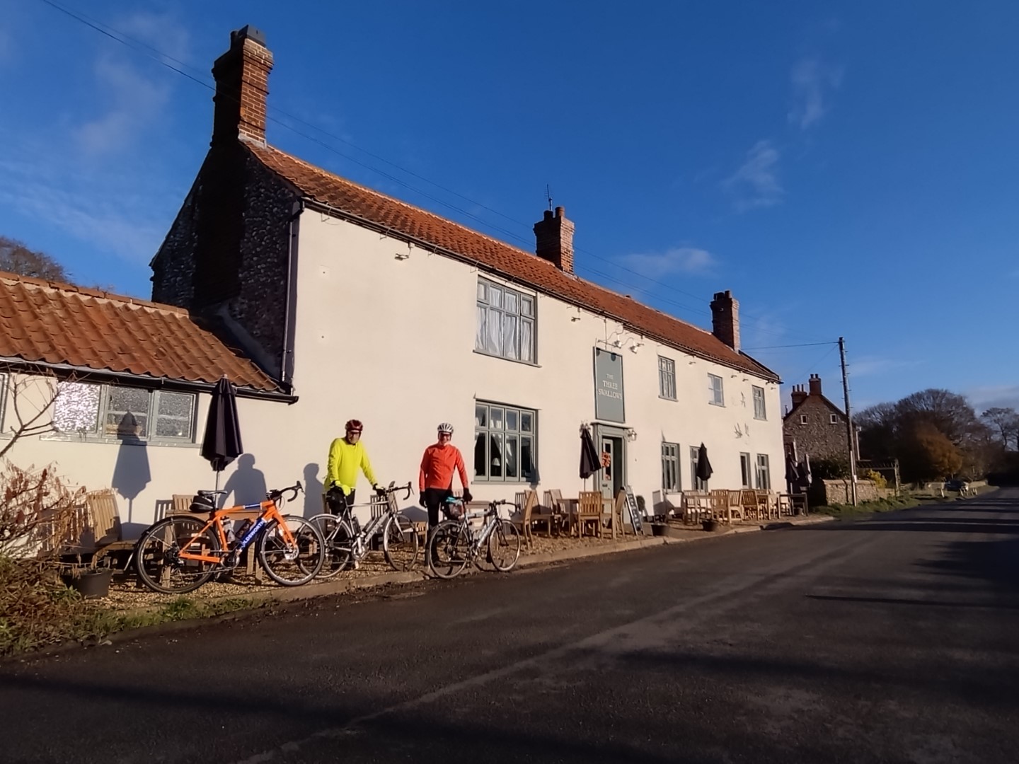 So Mark and Chris set off from PC on a very chilly morning with the promise of a few showers later in the morning (which we duly got) and some flooded roads (which we also ‘enjoyed’) and meandered via West Beckham and Lower Bodham to pick up Ian. Ian then led the way through Hempstead, Plumstead, Edgefield, then heading west to skirt Briston, continuing through Melton Constable, where we turned north through the pretty village of Briningham, then onto Brinton and Sharrington.