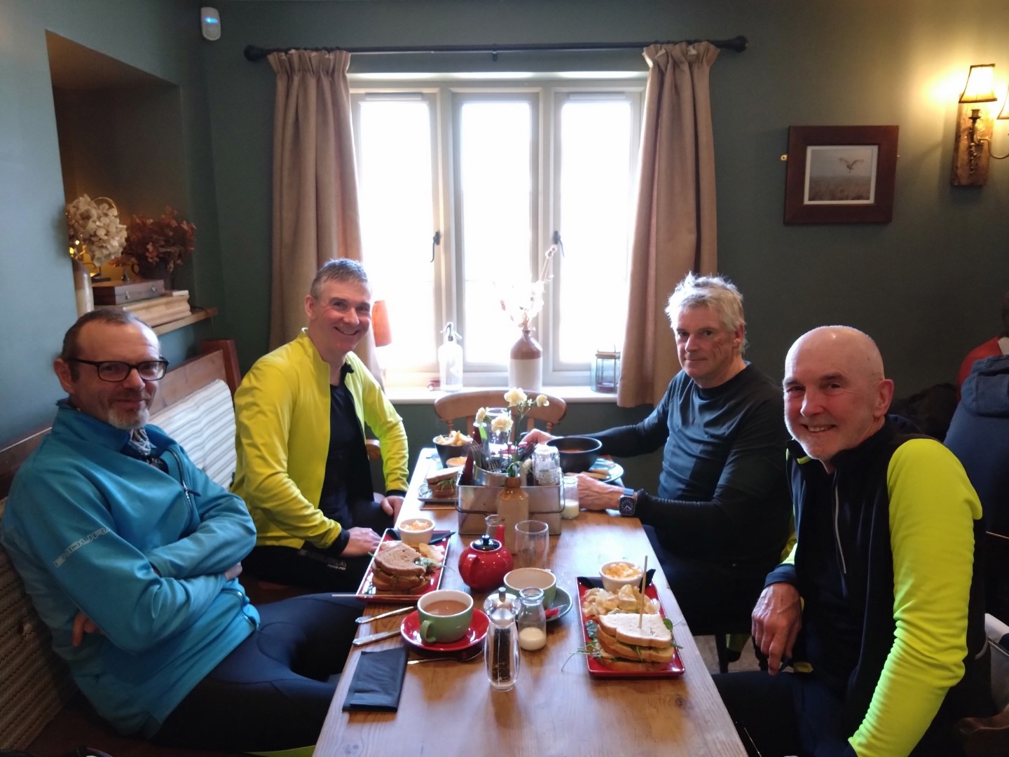 Another dry and sunny morning though with a cold easterly wind, greeted three Wheelers at PC. They set off on mainly dry roads through Gresham and Bessingham to pick up Neil at Matlaske crossroads and then headed south via Itteringham, Cawston, the Witchinghams, with a stop to look at the flooded Wensum at Lenwade.