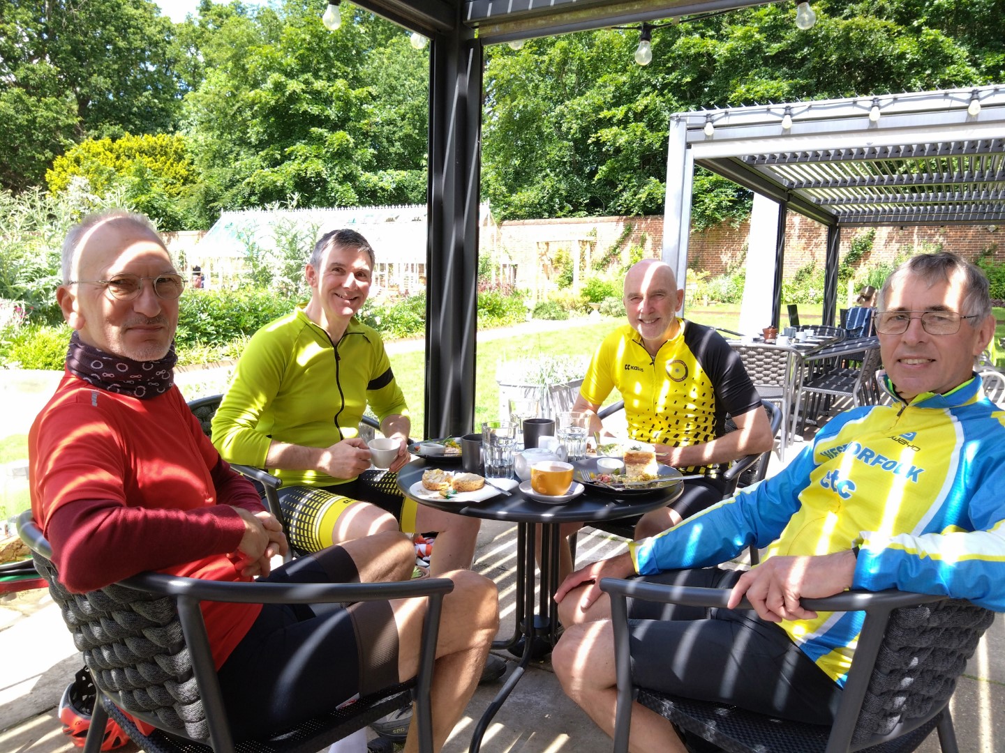 After lunch Malcolm headed for Acle and a return trip on Reedham ferry for a round trip of about 40 miles. The rest headed to Panxworth, Little Plumstead and Salhouse, turning onto quieter roads to Crostwick, Frettenham, Hainford, Buxton and Brampton. As we turned west for Aylsham and Graham continued north for Cromer we noticed the wind had changed from north east to south west, making progress a little harder. We went to Able Heath and Oulton, where Jim took the Irmingland road to Corpusty and the lanes to Briston and home for a total ride of 67 miles. This left Neil and myself to head to Itteringham and Neil’s turn off for Mannington Hall. By now the wind had turned again and was now back to north east, so a headwind again for the last few miles to Barningham Winter, Red Barn Lane and PC.