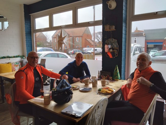 Andrew and Ian set off from High Kelling to meet Doug at PC. Ian didn’t quite make it to PC as he took a call from his brother-in-law on the way (something about a pair of blue tights?…) Despite some early drizzle the weather remained dry all day, though there was a persistent SW breeze averaging 20mph. The route from PC took us directly south to Itteringham and towards Oulton, turning east to Oulton Street and skirting Aylsham. A moment’s hesitation at Aylsham where we contemplated stopping early given the forecast, but no, the Three Musketeers were all up for carrying on, especially with the lure of a Full English Breakfast at Watsons!