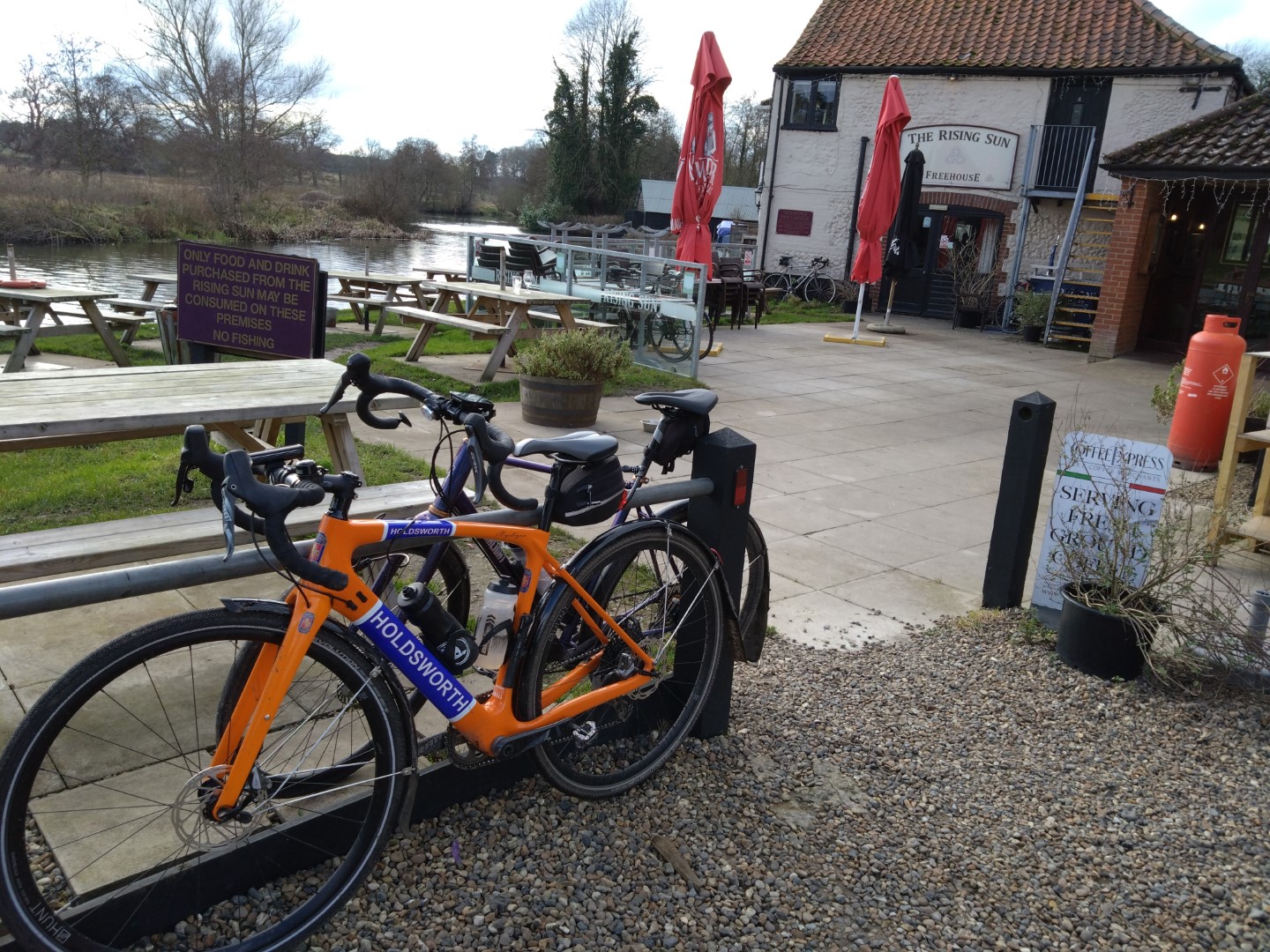 On yet another chilly and overcast morning, Andrew, Chris, Mark and Neil met at PC for the ride south to Coltishall, picking up Ian at the top of Red Barn Lane. The route before lunch was largely downhill but into the southerly headwind and took us initially via Gresham, Sustead and Hanworth. We then crossed the Norwich Road and continued on to Thorpe Market, Gunton and Bradfield before skirting the suburbs of North Walsham. This involved a fair climb up Bluebell Road/Marshgate to the Infant School and then a descent down to Whitehorse Common. (Ian remarked that maybe North Walsham had once been an ancient Hill Fort? Nonsense really.) Anyway, onwards via Meeting Hill and Worstead and its impressive church. Heading south out of Worstead, we skirted Tunstead and turned southwest to arrive at the Rising Sun just before midday.