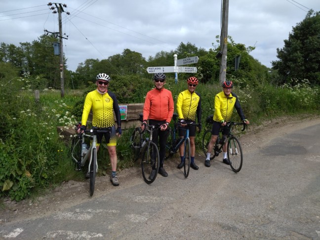 At Itteringham Common we stopped to wave Andy off but he was having none of it! He was enjoying our company so much that he stayed with us through Itteringham and up to Little Barningham where he took the Matlaske Road to head back home to Corpusty. The remaining four riders continued on to Plumstead, Baconsthorpe and the Bodham Hill climb (notorious for causing an unnecessary sprint to the top!) Bizarrely, Andrew stopped and said he had to take a call shortly before the climb and that we should carry on, thus he missed out on the chance to take the day’s “Polka Dot Jersey”. Or not wanting to get involved? Who knows. In the event, there was no sprint so honours even. At the foot of New Road, Ian turned left for High Kelling leaving Mark and Chris to head back to PC.