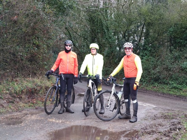 Four Wheelers met at PC. The mood was sombre. It was cold and it was raining. Why hadn’t Mr. Sensible cancelled the ride? Best guess is it was Ian’s fault. His message the previous evening said he’d join the peloton at Gresham Church so if conditions were OK for Ian nobody would want to show weakness and cancel! So the Damp Four set off and duly picked up Ian at said church, a couple of minutes late, apparently due to Chris adjusting his new head gear. Picture below…