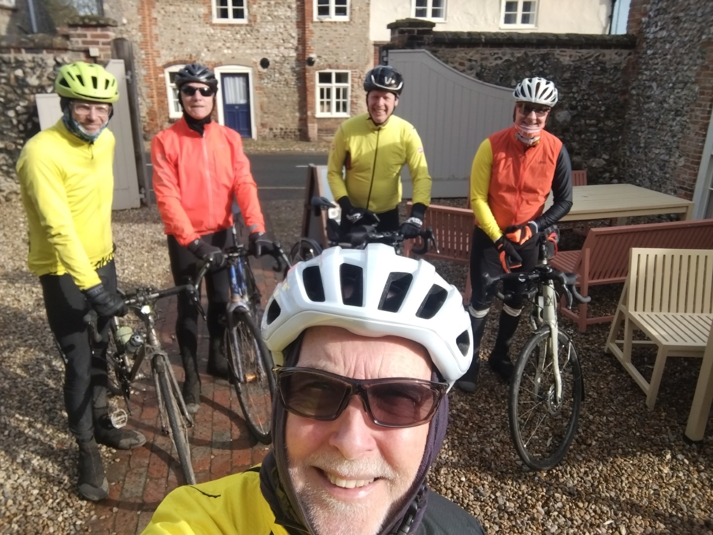 Mark, Neil, Doug, Chris and Andrew met at a dry PC following a night and early morning of rain, but they were pleased to be faced with what may have been the warmest ride of 2026. With that, they set off towards Bodham and on to High Kelling to collect Ian. At this point, Doug and Ian then spent the rest of the morning trying to work out their undiagnosable squeaks. You’ve got to love cycling!