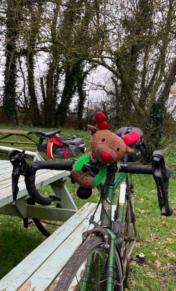 No ride photo today, but since we were close to the cafe at Themelthorpe I think its legitimate to use the one below from last Saturday. Somehow a toy reindeer appeared on the handlebars of Chris’s bike over lunch. Can’t think how that happened! It didn’t seem to slow him down much.