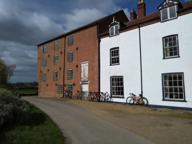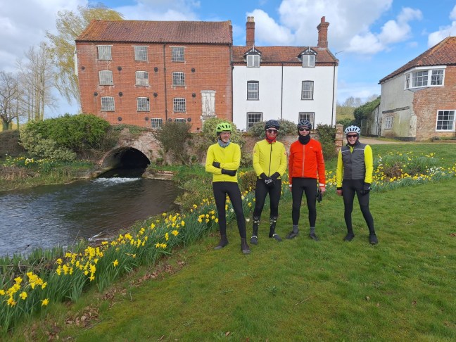Chris left us early to get some TT training in and the remaining 5 set off into the chilly wind for home. The first leg North through Gressenhall, East Bilney and Brisley was still windy, but this became easier as we turned East to Broom Green and Bintree Mill. The daffodils were out at the Mill and we stopped on the bridge for the usual photo opportunity.