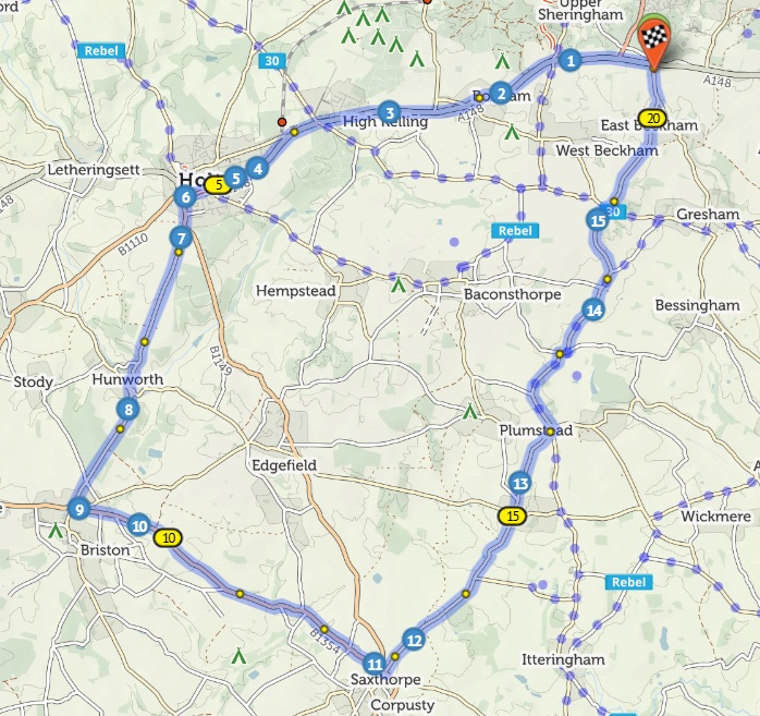 A set 20 mile chain gang ride to give riders experience of riding in a group and working together at race pace and for training. The group rides as a single pace line with stronger riders spending more time on the front. The idea is to work together making the group pace as fast as possible and giving everyone a good workout. It will follow a circular route starting at the normal club run start location at the Anglian Water depot, Upper Sheringham then heading inland to West Beckham, Baconsthorpe, Holt, Hunworth, Briston, Saxthorpe, Little Barningham and back to the start. Option to meet on the route near Holt. Starts at 1pm. Will be cancelled if raining (or snowing!).