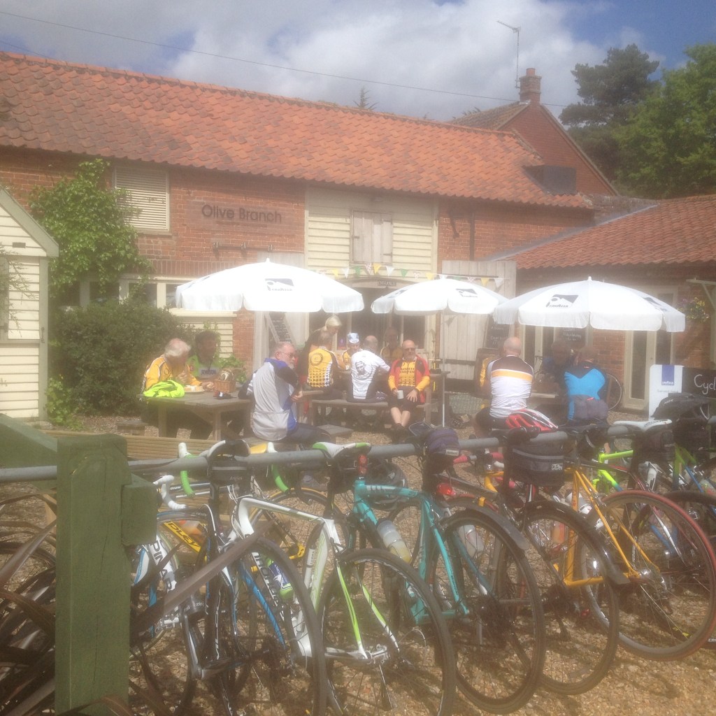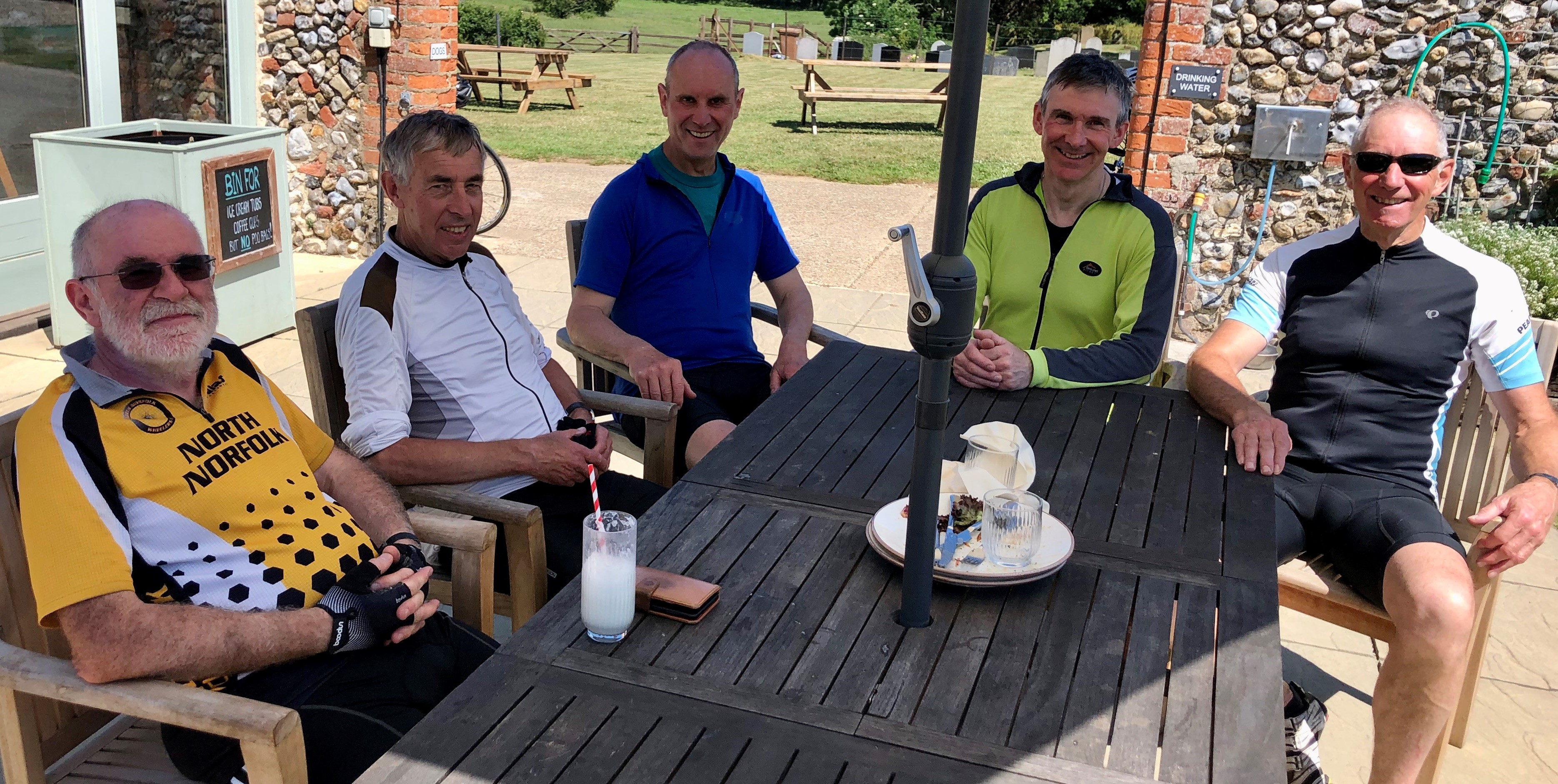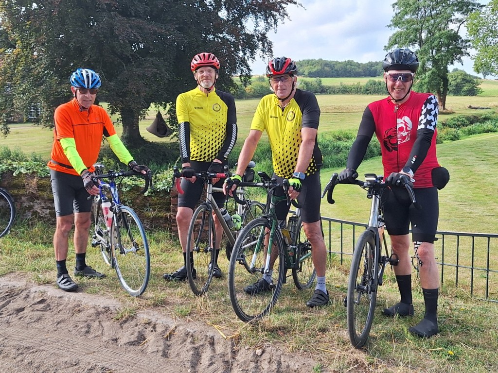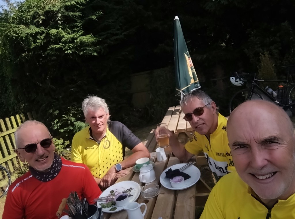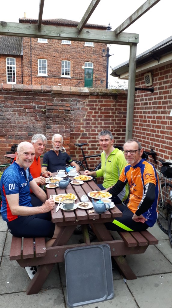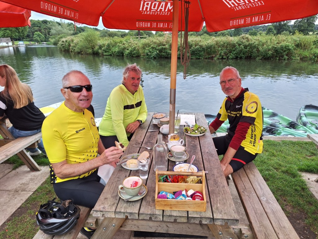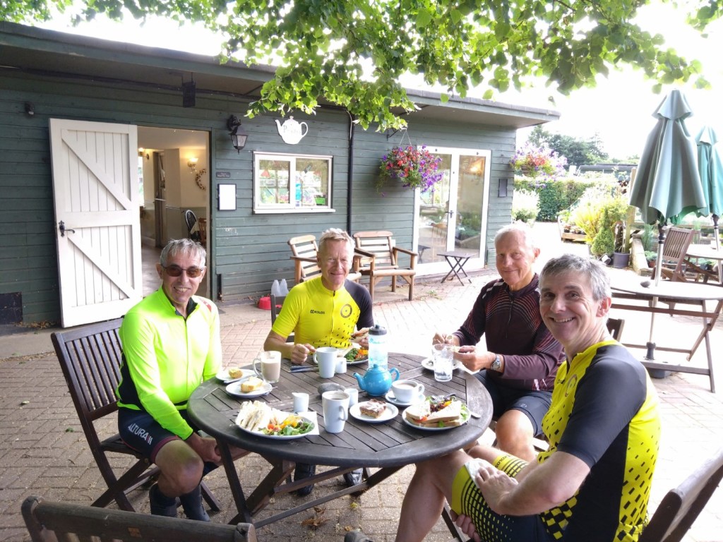 Where’s the air gone?Enjoying lunch at The Rising Sun, Coltishall, 4th Sept 2024. L-R Andrew B, Chris S, Malcolm S, Mark M cameraAll smiles at Bintree Mill after 20miles. L-R Graham A, Neil Mc and our 100+ milers Chris S, Doug H. 31st Aug 2024Lunch at Smallburgh Crown 28th Aug 2024 L-R, Malcolm S, Chris S, Graham A (with hat), Ian ADrying out upstairs at Poppylands, Horsey. 24th Aug 2024. L-R, Chris S, Doug H, Mark M camera.Always fun tea cosies at Poppylands, Horsey. 24th Aug 2024Purdy’s Tearoom, 21-August-2024. L-R: Graham A, Duncan A, Graham J Mark M. Ian A camera.Ian A at Blickling Hall en route to Purdy’s, 21-August-2024.Natural Surroundings 14-Aug-2024, L-R Chris S, Clive aka “The Sausage Pirate”, Mark M, Andrew B. Ian A camera.Bray’s Pork Pies HQ, Bayfield EstateChris S and Graham A enjoying lunch in the sun at Chrysalis Cafe, Sparham Hill. 6th August 2024Bugs at the Bug Park, Sparham Hill. 6th August 2024Puncture #2 for Neil S. Neil Mc, Doug H, Graham A share his dismay. Beeston area 20th July 2024New Jersey Boys, Hempstead 10-Jul-2024. L-R Andrew B, Duncan S, Chris S, Mark M, Ian A cameraArtisan Café, Alby, 10-Jul-2024. L-R Mark M, Ian A, Andrew B, Chris S, Duncan S, Doug H camera, Graham A out of shot.Heydon Tearooms from village green 26-Jun-2024Heydon Tearooms back garden 26-Jun-2024. L-R: Mark M, Ian A. Andrew B camera.Bright red poppies near East Rudham, 22nd June 2024Café Gardens, Little Plumstead 19-Jun-2024Lunch in the sunshine (finally!), The Walled Garden café, Little Plumstead 19-Jun-2024. L-R Malcolm S, Mark M, Ian A, Graham A.Hydrating at The Fur & Feather, Woodbastwick 19-Jun-2024The Barns Café North Creake 07-Jun-2024. L-R Doug H, guest Phil, Mark M. Ian A camera.Adding some colour to the countryside in the new Wheelers kit, Ian A, Mark M, 8th June 2024L-R, Ian A, Graham A, Duncan S, Mark M camera, enjoying good coffee and cake at Java Bean, RAF Coltishall, 5th June 2024Fresh & fluffy chocolate cake, Java Bean Café, RAF Coltishall 5-Jun-2024Felmingham Church 1st June 2024 L-R, Graham A, Malcolm S, Neil S, Heather, Jim H, Neil M, Doug H, Mark M cameraSpanish Galleon Replica Andalucia, Gt Yarmouth 1st June 2024Humpty Dumpty and friends sitting on a wall plus chipmunk, Bintree Mill 29-May-2024. L-R Ian A, Duncan S, Neil M, Andrew B, Mark M.Sculthorpe Mill 29-May-2024. L-R Duncan S, Mark M, Neil M, Ian A camera.Barsham Brewery stop 29-May-2024.Barsham Birthday Beers on Duncan, Barsham Brewery 29-May-2024. L-R Bitter Old Bustard best bitter, Oaks amber bitter.Enjoying an ice-cream rain break at Dann’s Farm shop, North Tuddenham 25-May-2024, L-R Chris S, Ian A, Mark M.The Old Diary, Stanfield 15-May-2024 L-R Chris S, Andrew B, Ian A, Mark MCake Scoffing at The Old Dairy 15-May-2024 L-R Chris “I’m dieting” S, Andrew B. Ian A cameraBintree Mill 15-May-2024 L-R Mark M, Andrew B, Chris S. Ian A cameraResting Scarecrow? Wighton 11-May-2024 photo Ian A“The Mole Whisperer”, Wighton 11-May-2024 photo Ian ALittle Miss Muffet plus spider, Wighton 11-May-2024 photo Ian APreparing to saddle up, Gt. Bircham Windmill 11-May-2024 photo Ian ACorned beef hash in a mess tin with a Churchill tea cosy – Poppylands 4th May 2024. L-R Graham A, Malcolm S, Neil M, Mark M cameraKeep Calm and Carry on Eating – L-R Doug H, Ian A Poppylands, Horsey 4th May 2024Happisburgh Lighthouse 4th May 2024 Ian A photoHappisburgh car park entrance, now very close to the sea. 4th May 2024. L-R Graham A, Mark M, Neil M, Doug H, Ian A cameraA Glorious Spring Day 4th May 2024 Ian A photoSunshine at Hoveton Hall cafe, 1st May 2024