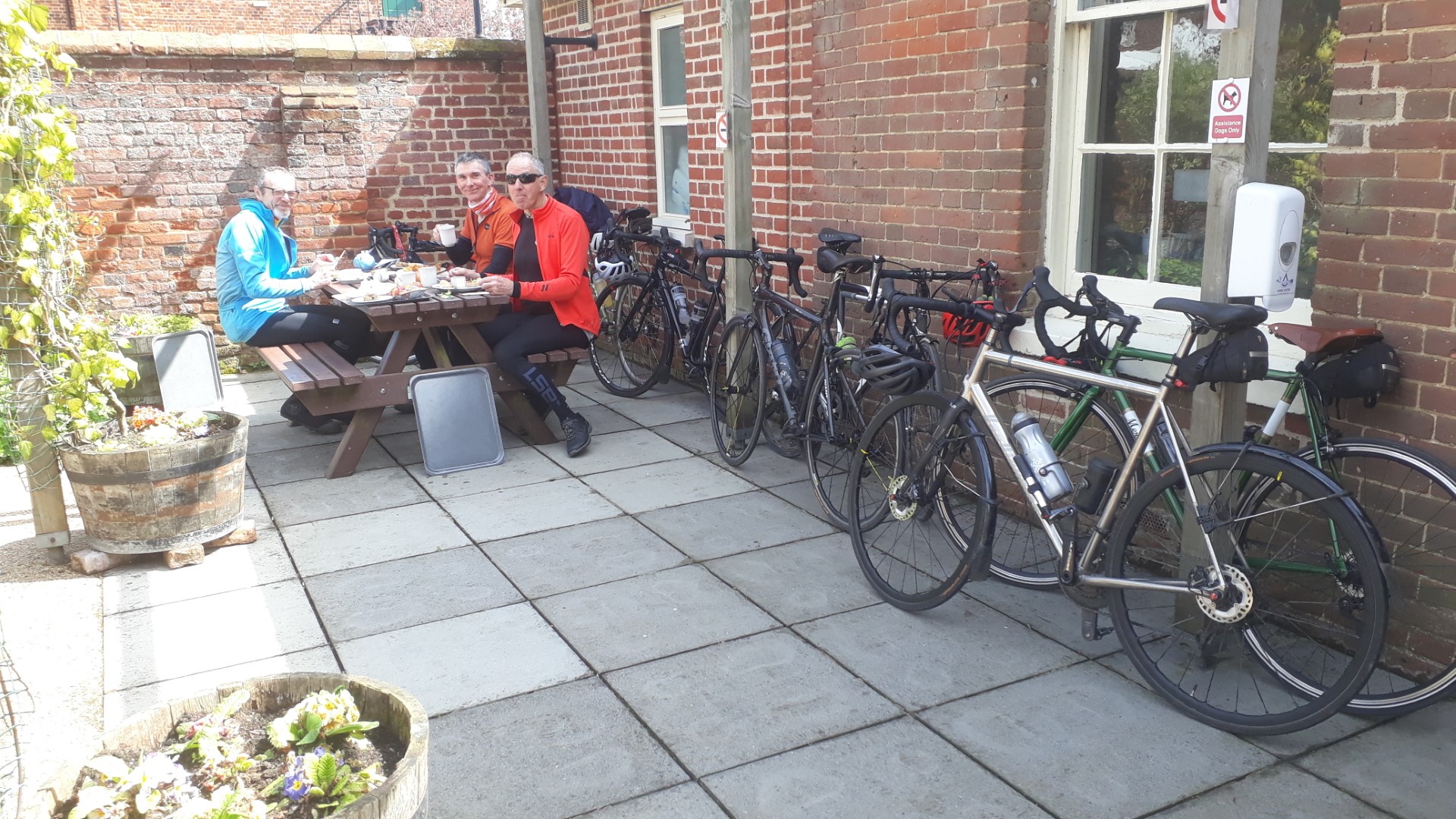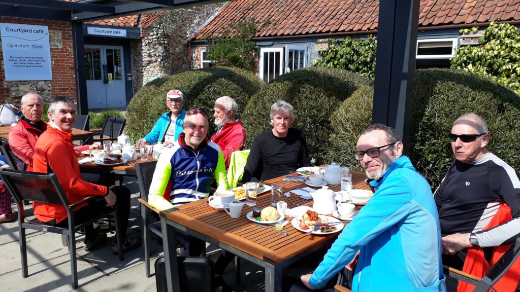 Wheelers enjoying lunch in the Gressenhall spring sun, L-R Neil Mc, Mark M, Andrew B, Ian A (camera). 29-04-2023Gressenhall Museum was one of 22 workhouses in Norfolk before the creation of the welfare state. 29-04-2023Lunch Stop at No.77 Coltishall. 22-04-2023Hungry Wheelers at the Garden Kitchen Cafe, Hoveton Hall – 19-04-2023Wheelers at Pensthorpe. Graham J, Mark, Harvey, Ian, Brian, Chris S, Neil Mc, Andrew. 15-04-2023Chris S with his brand new Merlin Classic 105 Steel Road Bike. Looking great! 15-04-2023Crossing the Wensum at Sculthorpe Mill, heading to Pensthorpe. 15-04-2023Breakfast at Binham Parlour, 05-04-2023, Wheelers L-R, Mark M, Andrew B, Chris S, Kevin H, Graham A, Ian A cameraOn route to Binham Parlour alongside Binham Priory 05-04-2023Watch the birdie. L-R, Chris S, Ian A for once, Mark M. Bintree Mill 22-03-2023Bintree Mill 22-03-2023. L-R, Chris S, Mark M, Andrew BGressenhall White Swan, L-R, Andrew B, Chris S, Mark M, Ian A camera. 22-03-2023Nine Wheelers bikes at Dunes Cafe, Waxham Barn, 18-03-2023Spot the Daffs – Honing Golden Mile 18-03-2023